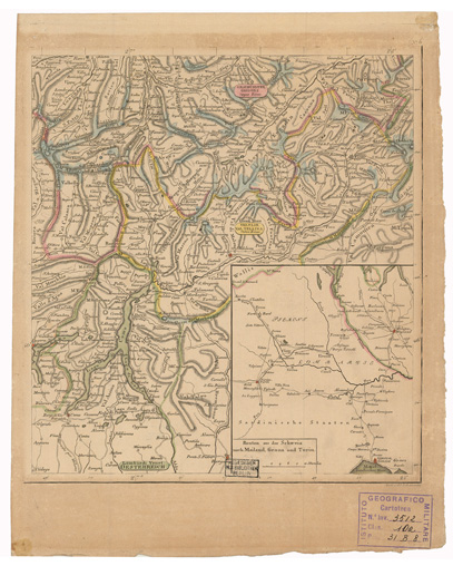 "Autore: J. Scheurmann Fogli 6+1 (titolo e segni convenzionali) Tipo di stampa: incisione su rame coloritura a mano, rappresentazione orografica dimostrativa. Grafia in lingua tedesca. Inventario SBN 7-3512 "