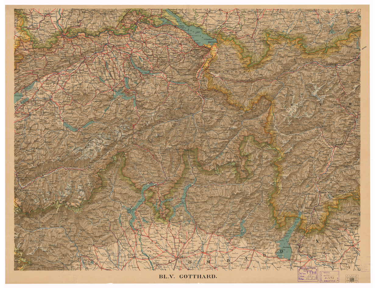 "Autore: J. Randegger Fogli 9 - Tipo di stampa: policroma, rappresentazione orografica a sfumo. Inventario SBN 7-1196"