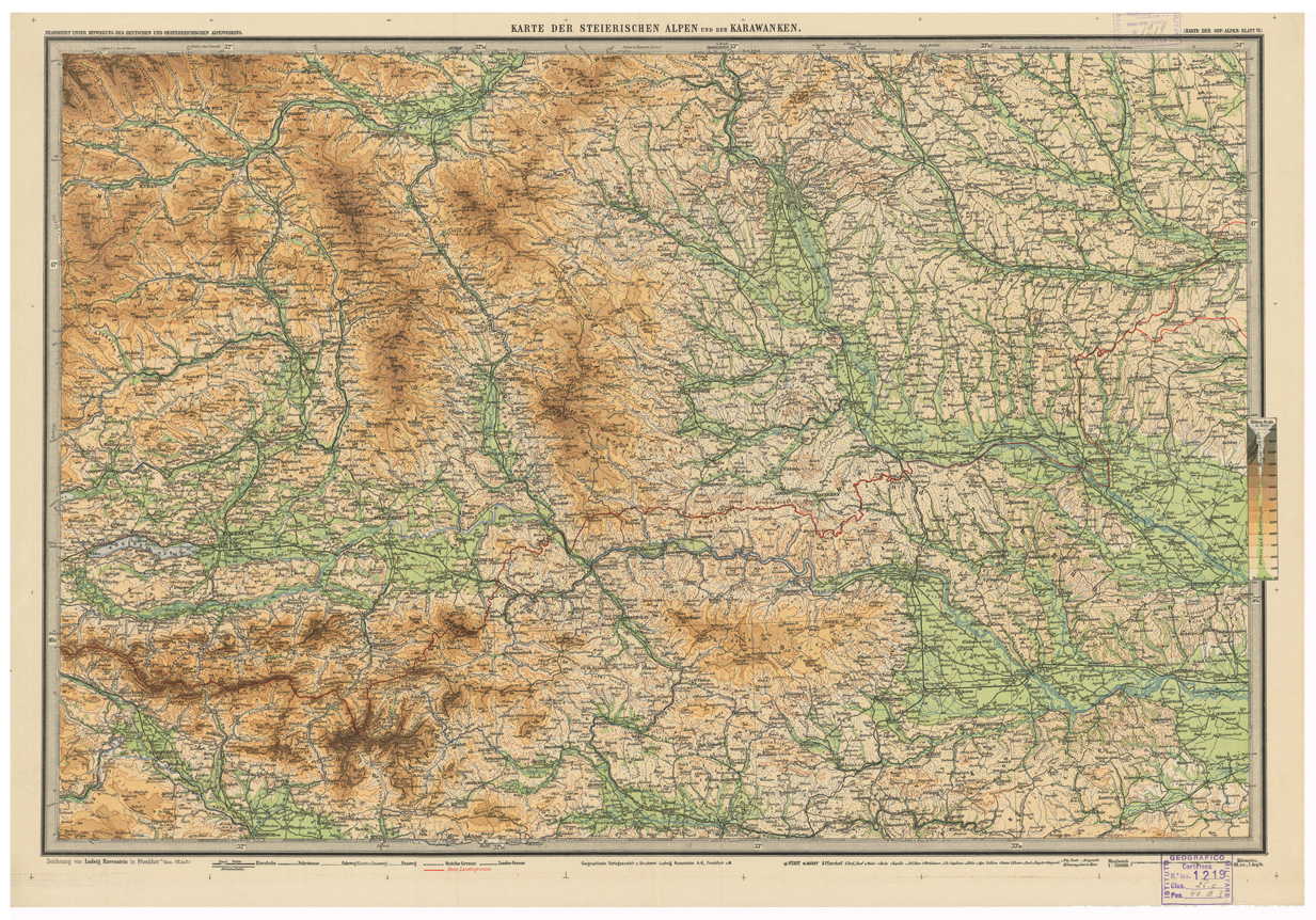 "Autore: Ravenstin Ludwig Fogli 8 più quadro d'unione - Tipo di stampa: policroma, rappresentazione orograficascala tinte ipsometriche. Inventario SBN 7-1219"