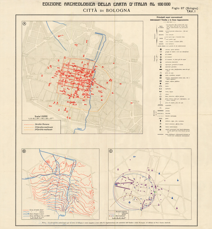 EDIZIONE ARCHEOLOGICA DELLA CARTA D'ITALIA PIANTA DELLA CITTA' DI BOLOGNA FOGLIO 87 TAVOLA I