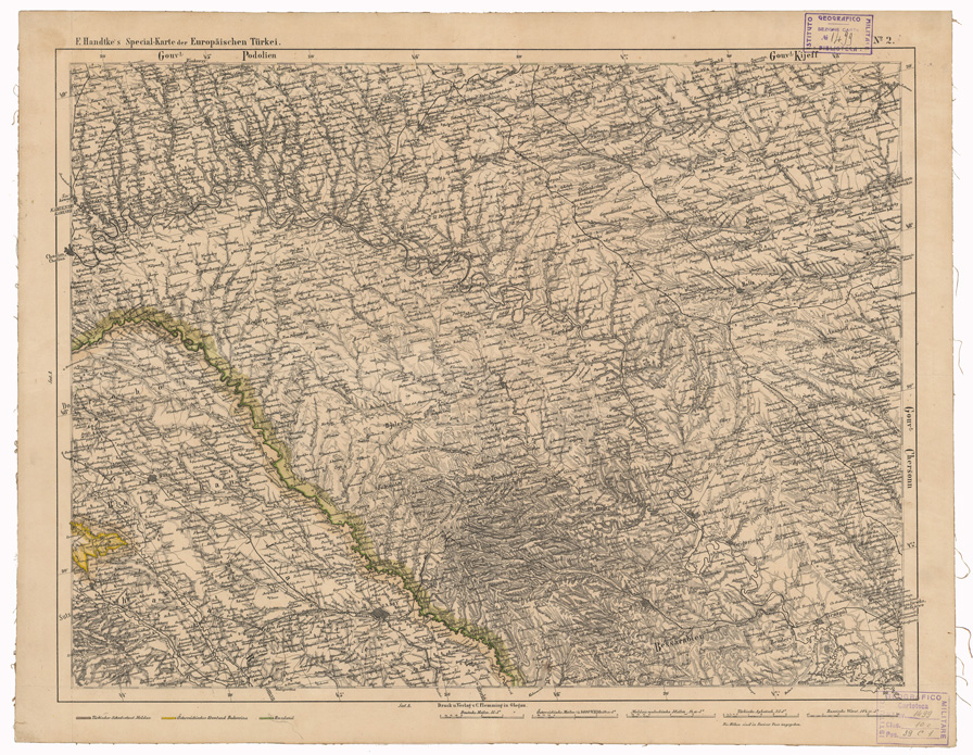 "Autore: F. Handtke Fogli 20 su tela Tipo di stampa: policroma, rappresentazione orografica a tratteggio. Inventario SBN 7-1499 "