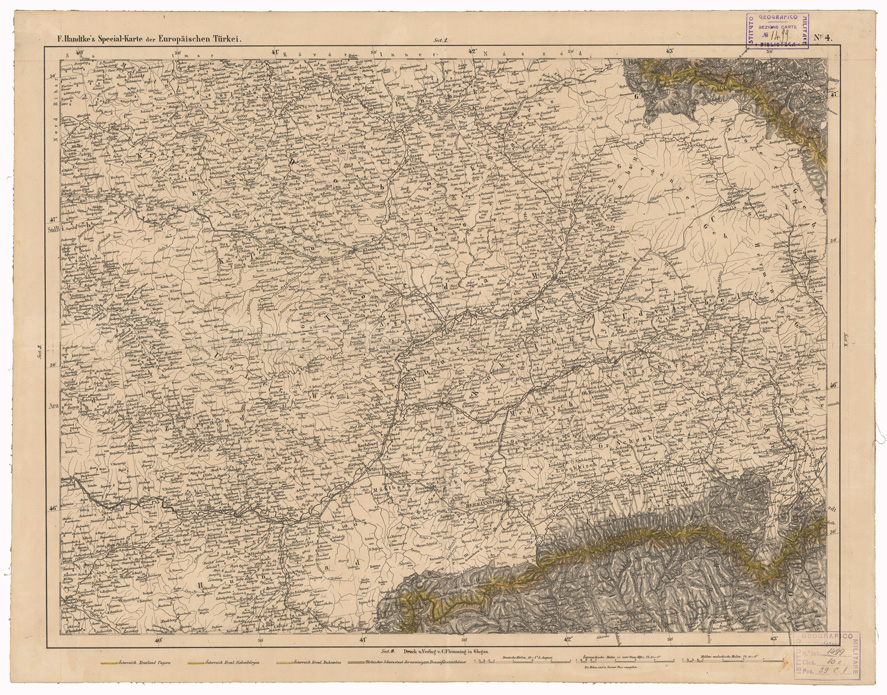 "Autore: F. Handtke Fogli 20 su tela Tipo di stampa: policroma, rappresentazione orografica a tratteggio. Inventario SBN 7-1499 "