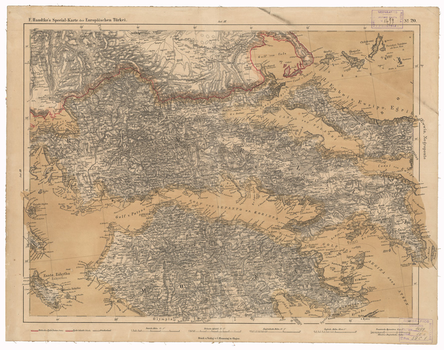 "Autore: F. Handtke Fogli 20 su tela Tipo di stampa: policroma, rappresentazione orografica a tratteggio. Inventario SBN 7-1499 "