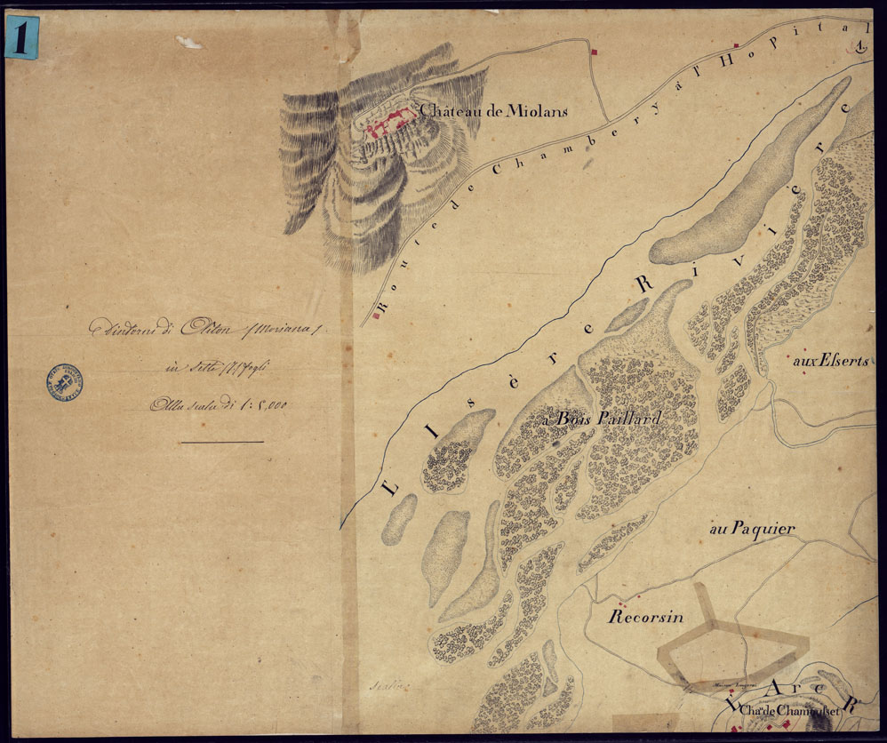 "Disegno a penna a più colori su carta lucida in quattro fogli grandi e tre mezzi fogli. Nel documento è rappresentato l'ultimo tratto della valle inferiore dell'Arc da Aiguebelle alla sua confluenza nell'Isere e la parte dell'adiacente corso dell'Isere. In calce ad uno di questi la data e la firma "Turin le 24 janvier 1818. JOSEPH CONTI Ing.e". Il titolo è certamente posteriore al disegno della carta. Disegno con orografia a tratteggio, ricco di nomi e di particolari relativi specialmente all'alveo del fiume e delle sue numerose ramificazioni. Di uno dei quattro grandi fogli vi è anche una copia artisticamente finita in disegno su carta. (Cfr. al n. 27 d'Ordine - Docum. d'Arch. 9902)"