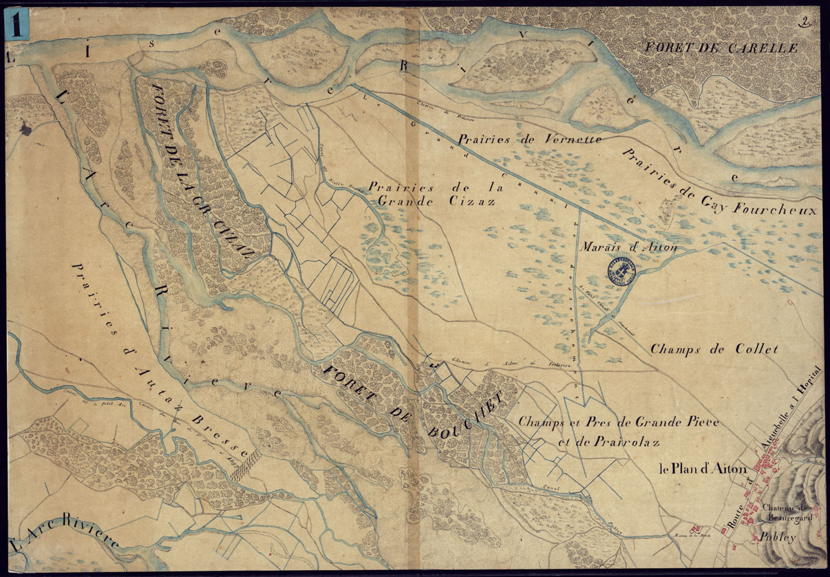 "Disegno a penna a più colori su carta lucida in quattro fogli grandi e tre mezzi fogli. Nel documento è rappresentato l'ultimo tratto della valle inferiore dell'Arc da Aiguebelle alla sua confluenza nell'Isere e la parte dell'adiacente corso dell'Isere. In calce ad uno di questi la data e la firma "Turin le 24 janvier 1818. JOSEPH CONTI Ing.e". Il titolo è certamente posteriore al disegno della carta. Disegno con orografia a tratteggio, ricco di nomi e di particolari relativi specialmente all'alveo del fiume e delle sue numerose ramificazioni. Di uno dei quattro grandi fogli vi è anche una copia artisticamente finita in disegno su carta. (Cfr. al n. 27 d'Ordine - Docum. d'Arch. 9902)"