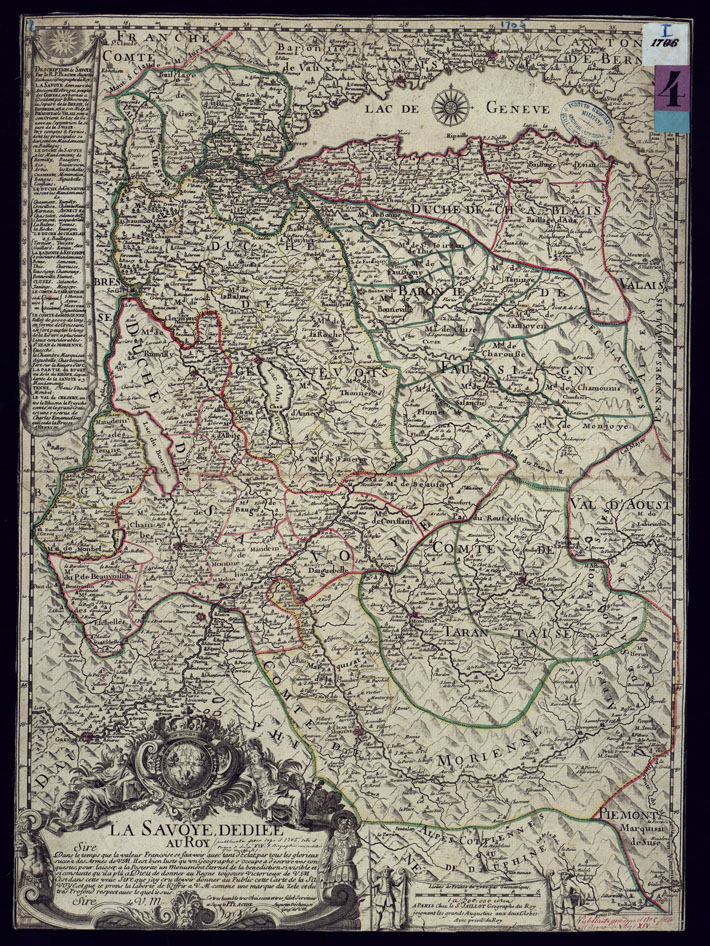 "A Paris chez le S. Jaillot Geographe du Roy, joignant les grands Augustins aux duex Globes. Avec privil: du Roy. Incisione su rame in foglio unico. Orientazione normale. Longitudini calcolate dal meridiano delle isole di Capo Verde. Orografia prospettica a monticelli. Abitati principali rappresentati schematicamente in pianta e riempiti in rosso gli altri con torrri e case o con circolini. E' tracciata la rete stradale. Confini a colori. A sinistra un cartello con un cenno descrittivo e le divisioni amministrative della Savoia, firmato da Augustin Dechaussé. due scritte a biro, probabilmente posteriori alla realizzazione della carta, riportano: "Pubblicata poco dopo il 1705 sotto il regno di Luigi XIV"."