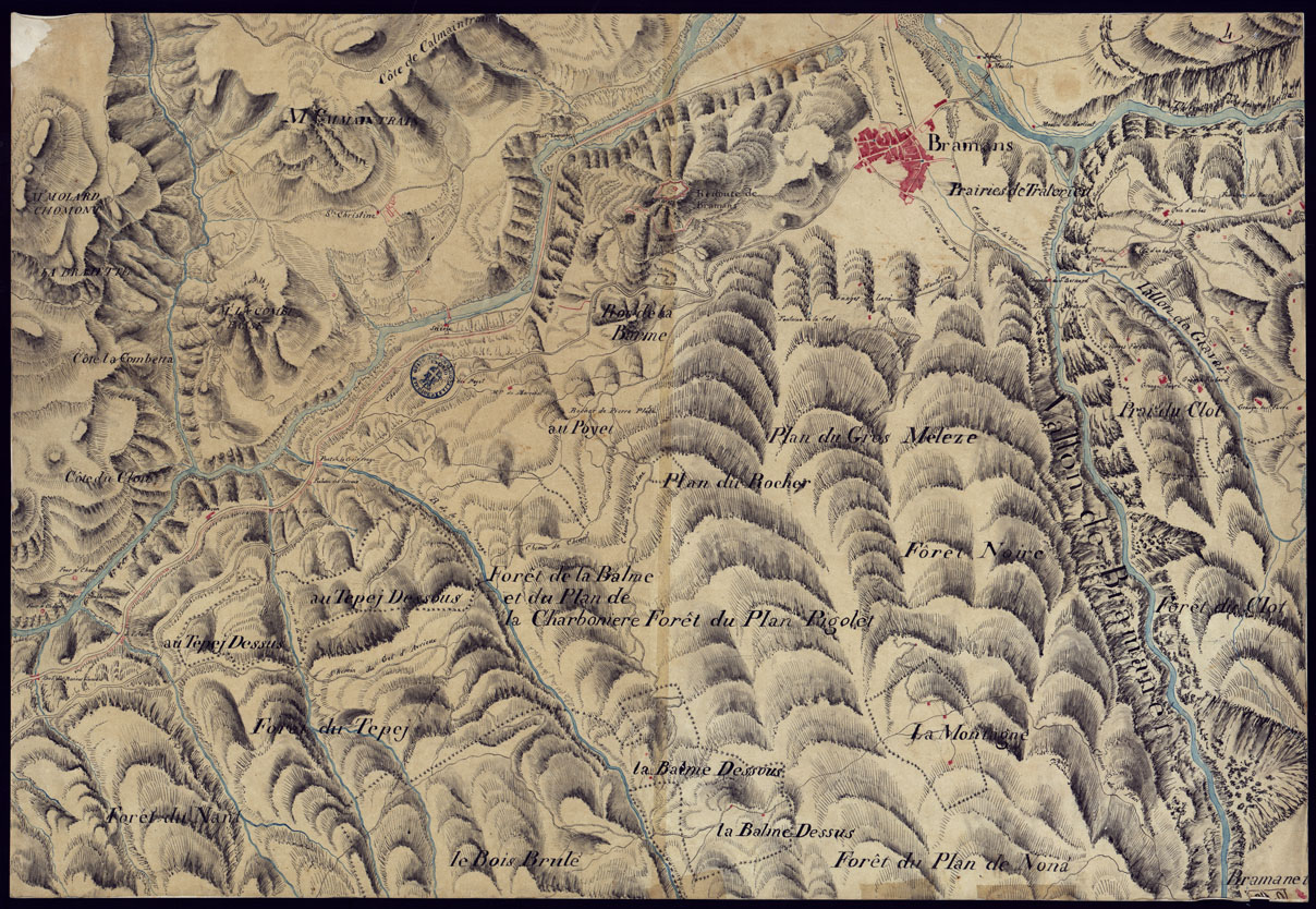 "Disegno a penna a più colori su carta lucida in 6 grandi fogli, comprendente la parte dell'alta valle dell'Arc sopra indicata. Il disegno è grossolano ma eseguito con efficacia artistica specialmente per quanto riguarda la figurazione della montagna. Alcuni dei fogli portano in calce un nome, fra parentesi, riferibile probabilmente all'artista che li disegnò (Vittorio Brambilla, Martini, Basso). Non porta indicazione di data ma da memorie d'archivio viene ritenuta del 1818."