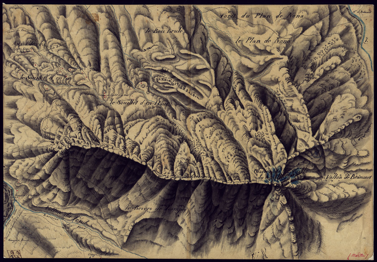 "Disegno a penna a più colori su carta lucida in 6 grandi fogli, comprendente la parte dell'alta valle dell'Arc sopra indicata. Il disegno è grossolano ma eseguito con efficacia artistica specialmente per quanto riguarda la figurazione della montagna. Alcuni dei fogli portano in calce un nome, fra parentesi, riferibile probabilmente all'artista che li disegnò (Vittorio Brambilla, Martini, Basso). Non porta indicazione di data ma da memorie d'archivio viene ritenuta del 1818."