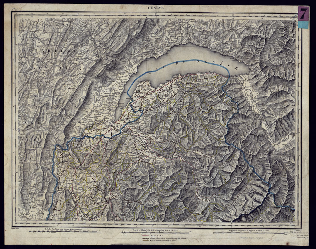 "Carta topografica Mlitare delle Alpi in 12 fogli. Si possegono soltanto i fogli n° 1 Ginevra e n° 4 Chambery oltre il montaggio Ginevra -Chambery montato su tela. Incisione di F. P. Michel sotto la direzione di Raymond. Orografia a tratteggio a luce obliqua. Rete stradale a colori (strade postali strade secondarie carreggiabili strade praticabili a cavallo). Abitati distinti secondo la loro importanza amministrativa. Confini a colori. Scale grafiche in metri, miglia d'Italia e leghe di Francia."