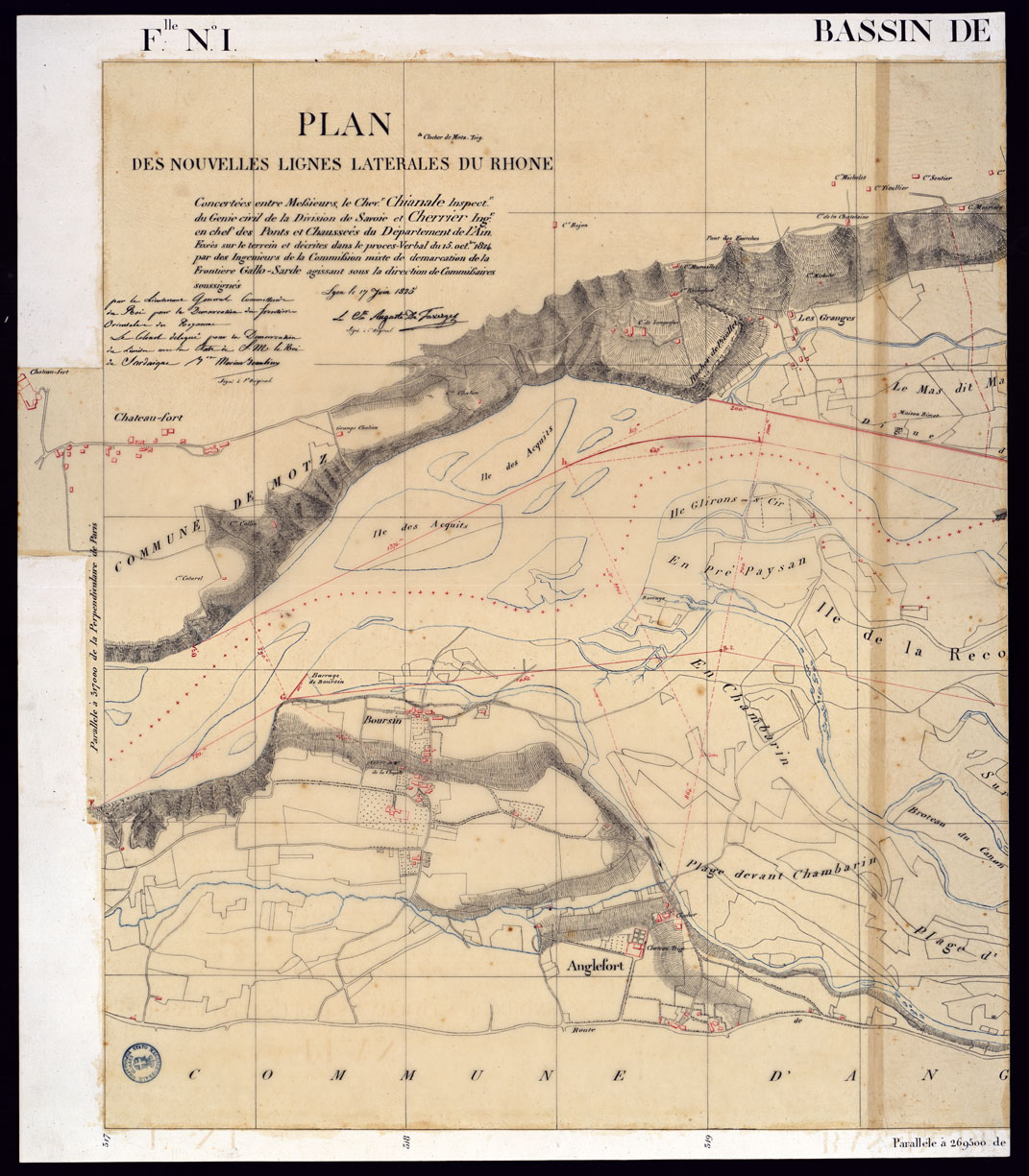 "Oltre il titolo indicato sul "Tableau d'assemblage" - Quadro d'unione - si leggono nei fogli distinti i titoli particolari: - Plan de nouvelles lignes laterales du Rhòne - Pour le Lieutenant Général commissaire du Roi pour la Demarcation des frontieres orientales du Royaume Le Colonel delegué pour la Demarcation des Limites avec les Etats de S.M. le Roy de Sardigne - Plan des nouvelles lignes laterales du Guiers . Disegno a penna su carta lucida, probabilmente copia di un disegno originale. La carta si compone di 21 fogli (dei quali i primi 4 in due parti) ed un quadro d'unione per cui complessivamente consta di 26 grandi fogli non totalmente riempiti. E' riprodotto il corso del Rodano da un punto a circa 2 km. a monte di Anglefort sino alla confluenza del Guiers ed il corso di quest'ultimo sino al Pont Saint Martin poco a monte di Les Echelles. Il disegno è in azzurro per le acque, in rosso per i fabbricati, le dighe, il confine e le misure di riferimento in nero per la rete stradale, il tratteggio orografico e le scritture. Il Quadro d'Unione alla scala di 1:100.000 porta in calce un elenco di 42 posizioni determinate per le loro coordinate rettangolari riferite alla meridiana ed alla perpendicolare di Parigi in base alle quali è tracciato il reticolato cassiniano della Carta. Documento interessante per la topografia storica dei fiumi rappresentati."