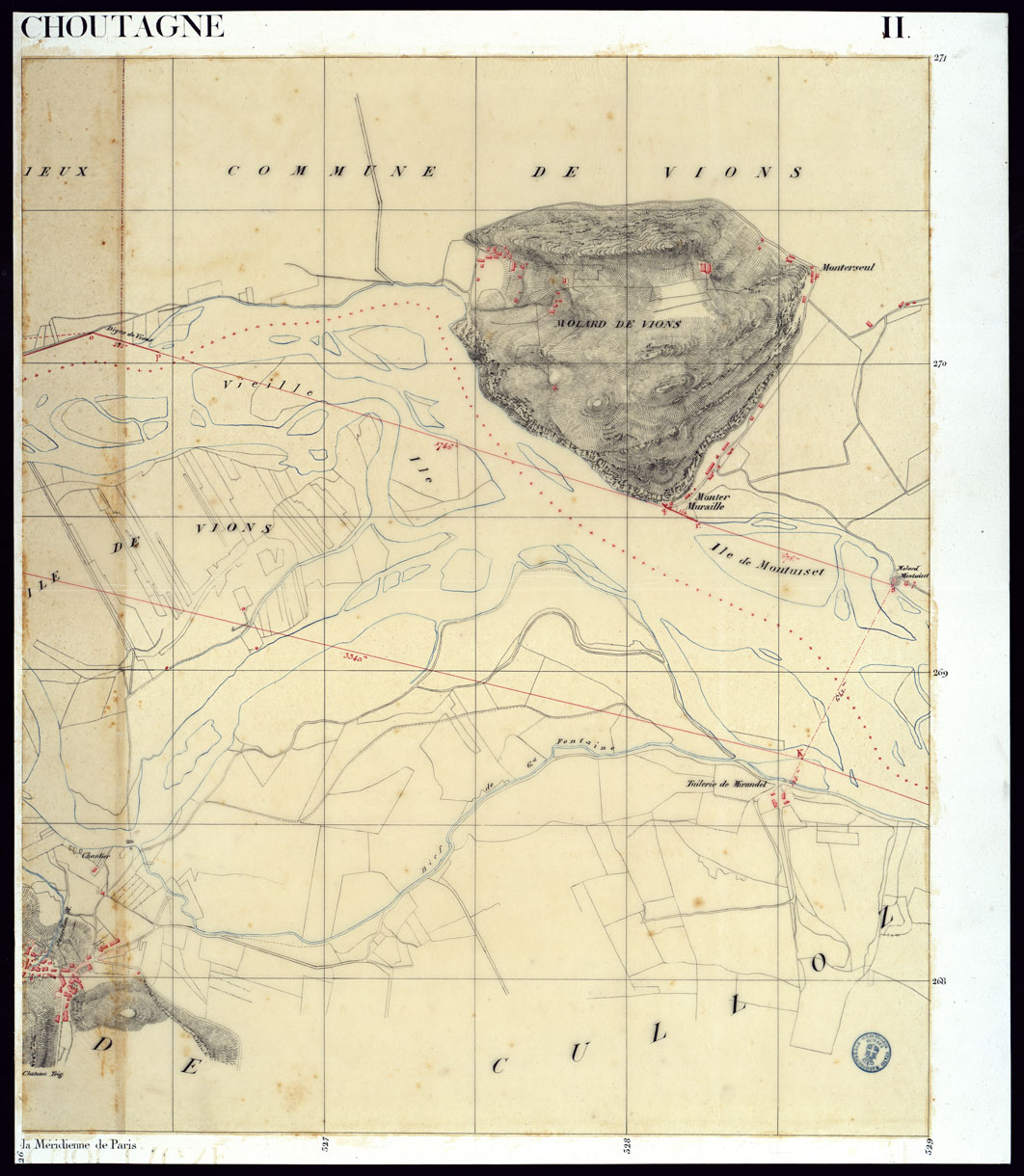 "Oltre il titolo indicato sul "Tableau d'assemblage" - Quadro d'unione - si leggono nei fogli distinti i titoli particolari: - Plan de nouvelles lignes laterales du Rhòne - Pour le Lieutenant Général commissaire du Roi pour la Demarcation des frontieres orientales du Royaume Le Colonel delegué pour la Demarcation des Limites avec les Etats de S.M. le Roy de Sardigne - Plan des nouvelles lignes laterales du Guiers . Disegno a penna su carta lucida, probabilmente copia di un disegno originale. La carta si compone di 21 fogli (dei quali i primi 4 in due parti) ed un quadro d'unione per cui complessivamente consta di 26 grandi fogli non totalmente riempiti. E' riprodotto il corso del Rodano da un punto a circa 2 km. a monte di Anglefort sino alla confluenza del Guiers ed il corso di quest'ultimo sino al Pont Saint Martin poco a monte di Les Echelles. Il disegno è in azzurro per le acque, in rosso per i fabbricati, le dighe, il confine e le misure di riferimento in nero per la rete stradale, il tratteggio orografico e le scritture. Il Quadro d'Unione alla scala di 1:100.000 porta in calce un elenco di 42 posizioni determinate per le loro coordinate rettangolari riferite alla meridiana ed alla perpendicolare di Parigi in base alle quali è tracciato il reticolato cassiniano della Carta. Documento interessante per la topografia storica dei fiumi rappresentati."