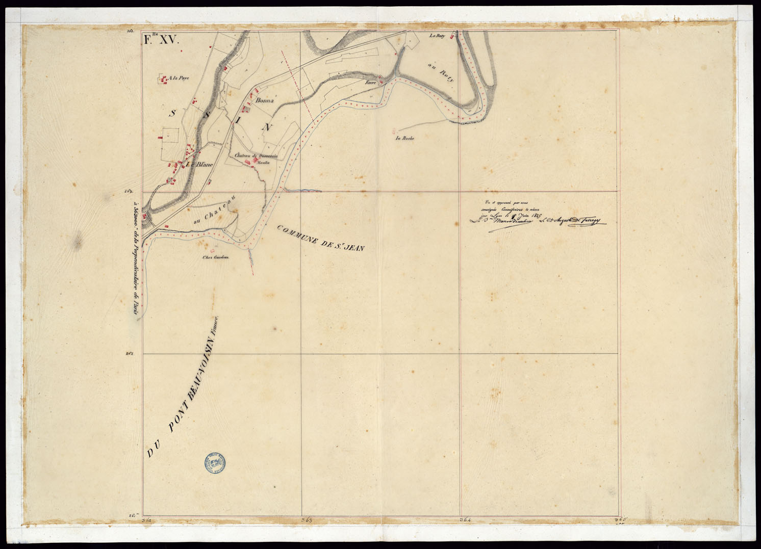 "Oltre il titolo indicato sul "Tableau d'assemblage" - Quadro d'unione - si leggono nei fogli distinti i titoli particolari: - Plan de nouvelles lignes laterales du Rhòne - Pour le Lieutenant Général commissaire du Roi pour la Demarcation des frontieres orientales du Royaume Le Colonel delegué pour la Demarcation des Limites avec les Etats de S.M. le Roy de Sardigne - Plan des nouvelles lignes laterales du Guiers . Disegno a penna su carta lucida, probabilmente copia di un disegno originale. La carta si compone di 21 fogli (dei quali i primi 4 in due parti) ed un quadro d'unione per cui complessivamente consta di 26 grandi fogli non totalmente riempiti. E' riprodotto il corso del Rodano da un punto a circa 2 km. a monte di Anglefort sino alla confluenza del Guiers ed il corso di quest'ultimo sino al Pont Saint Martin poco a monte di Les Echelles. Il disegno è in azzurro per le acque, in rosso per i fabbricati, le dighe, il confine e le misure di riferimento in nero per la rete stradale, il tratteggio orografico e le scritture. Il Quadro d'Unione alla scala di 1:100.000 porta in calce un elenco di 42 posizioni determinate per le loro coordinate rettangolari riferite alla meridiana ed alla perpendicolare di Parigi in base alle quali è tracciato il reticolato cassiniano della Carta. Documento interessante per la topografia storica dei fiumi rappresentati."