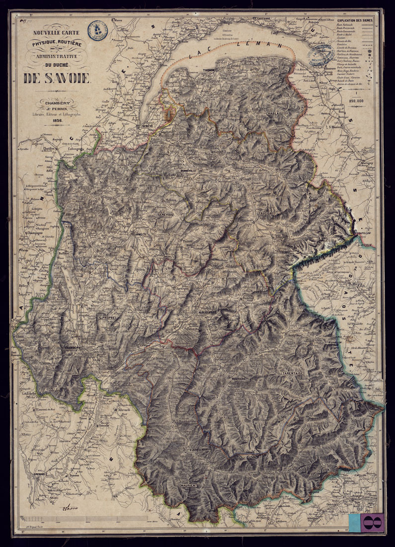 NOUVELLE CARTE PHYSIQUE, ROUTIERE ADMINISTRATIVE DU DUCHE' DE SAVOIE. CHAMBERY. J.h PERRIN, LIBRAIRE, EDITEUR ET LITHOGRAPHE 1856.