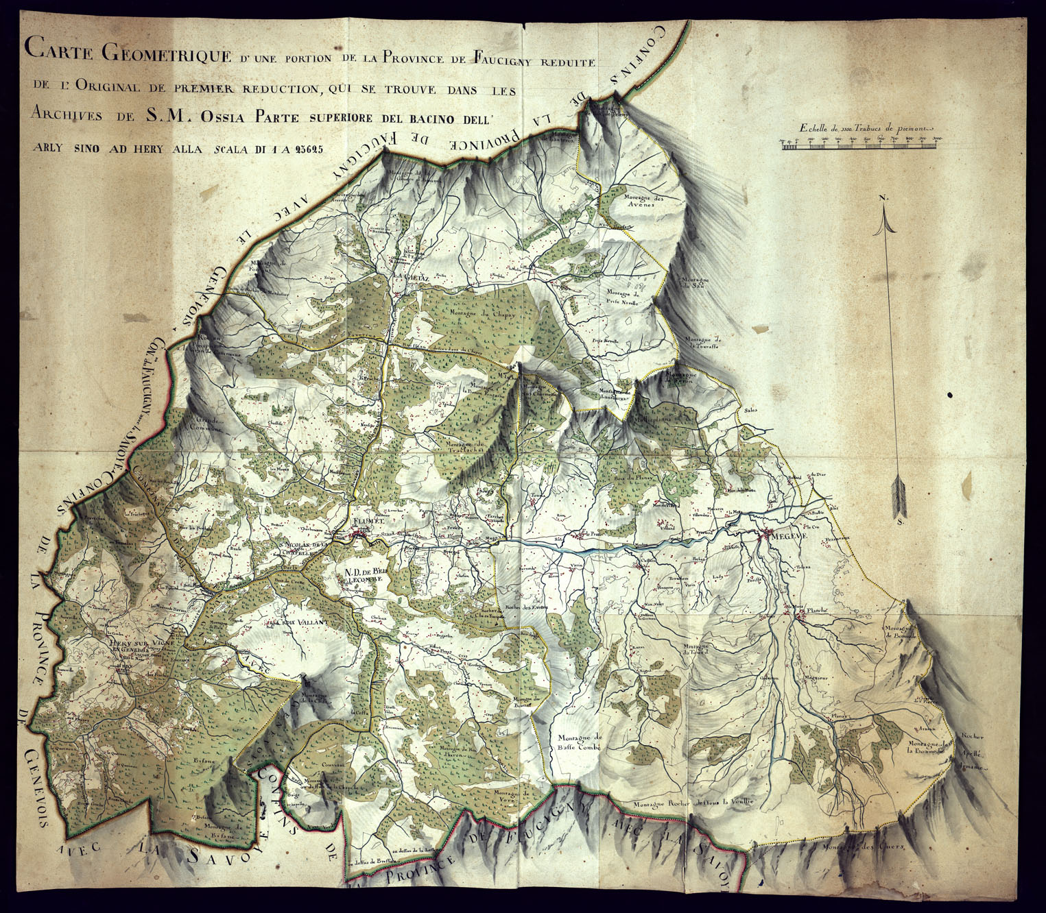 CARTE GEOMETRIQUE D'UNE PORTION DE LA PROVINCE DE FAUCIGNY REDUITE DE L'ORIGINAL DE PREMIER REDUCTION, QUI SE TROUVE DANS LES ARCHIVES DE S. M. OSSIA PARTE SUPERIORE DEL BACINO DELL'ARLY SINO AD HERY ALLA SCALA DI 1 A 23.625.