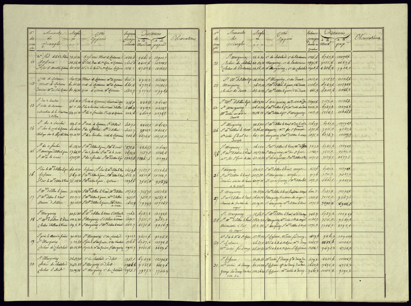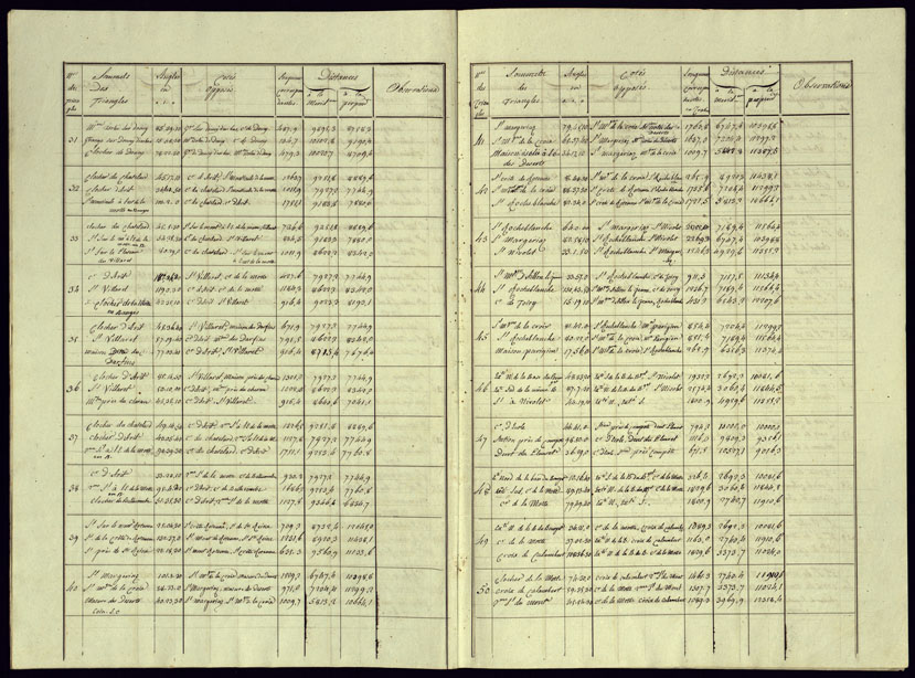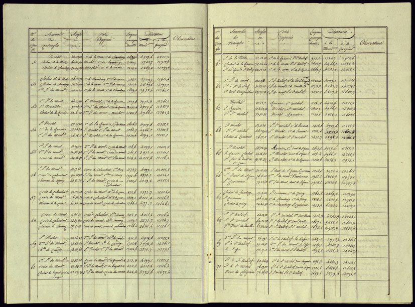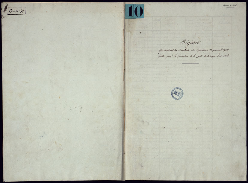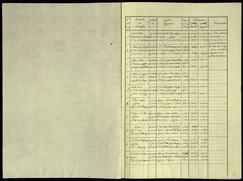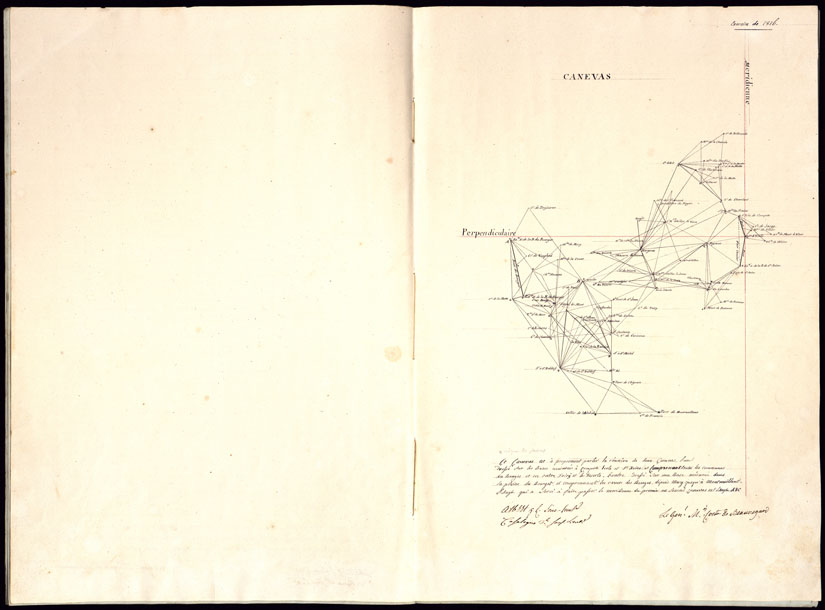"Libretto n. 1 annesso alla Carta delle Beauges in Savoja levata dal Sg.ri Uff.li del Corpo [Reale] di Stato Maggiore Generale nella campagna del 1816. Alla carta è allegato anche il fascicolo " BROUILLON DU REGISTRE PRESENTANT, [...]". Il registro comprende 85 triangoli di cui sono riportati gli angoli, i lati opposti e le coordinate rettangolari riferiti alla meridiana e alla perpendicolare del "Clocher d'Ecole". Sono uniti un grafico del reticolato con le indicazioni per le rispettive coordinate dei singoli vertici ed un grafico della triangolazione. L'uno e l'altro, al pari del registro, portano le firme dei Sous Lieut. Albert e Casalegno e del Generale M.is Costa de Beauregard. Da una nota apposta al grafico della triangolazione si deduce che questa si appoggia a due basi misurate a Compote Ecole e l'altra nella piana del Bourget."