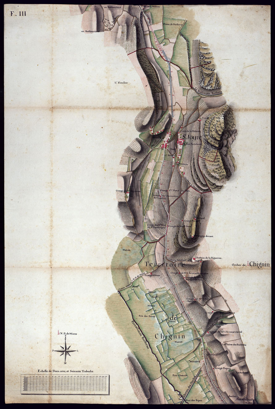 MODELE QUI SERT POUR L'UNION DES FEUILLES, QUI COMPOSENT LA CARTE DE LA GRANDE ROUTE DEPUIS CHAMBERY JUSQU'A S. JEAN DE MAURIENNE LEVEE SUR LIEUX DANS SUR LIEUX DANS ANNES 1781 ET 1782 PAR MARCHETTI INGENIUR TOPOGRAPHE DE S. M. - FOGLIO III.