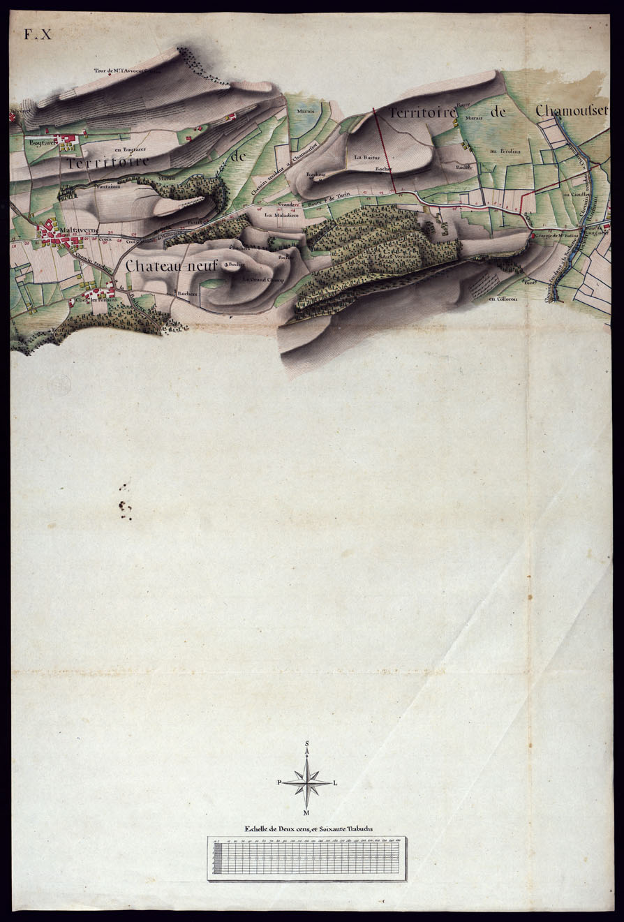 MODELE QUI SERT POUR L'UNION DES FEUILLES, QUI COMPOSENT LA CARTE DE LA GRANDE ROUTE DEPUIS CHAMBERY JUSQU'A S. JEAN DE MAURIENNE LEVEE SUR LIEUX DANS SUR LIEUX DANS ANNES 1781 ET 1782 PAR MARCHETTI INGENIUR TOPOGRAPHE DE S. M. - FOGLIO X.
