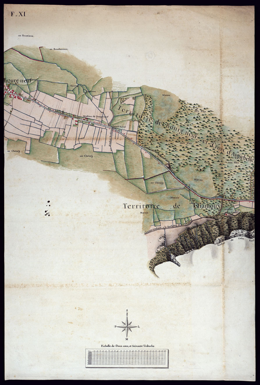 "La Carta è in 23 fogli e un quadro d'unione alla scala di 1:56.700. Scala grafica di 200 trabucchi = m. 0,129. Rappresenta la grande strada che seguendo il corso dell'Arc, mette in comunicazione Chambery con S. Giovanni di Moriana, ed una striscia adiacente di territorio variabile da circa mezzo chilometro ad oltre 1 km. tanto da una parte quanto dall'altra. La carta è frutto di regolari operazioni metriche sul terreno, condotte certo con notevole abilità. Il disegno, acquerellato a più tinte, riproduce accuratamente i caseggiati nella loro pianta geometrica, la rete stradale, i corsi d'acqua, le coltivazioni, la natura e le forme del terreno. Una linea rossa delimita i confini delle parrocchie. Dei piccoli numeri in rosso ai due lati della strada si riferiscono probabilmente agli appezzamenti catastali. In complesso è un pregevole lavoro e un prezioso documento sia per la topografia della Savoia sia per l'evoluzione storica della topografia."
