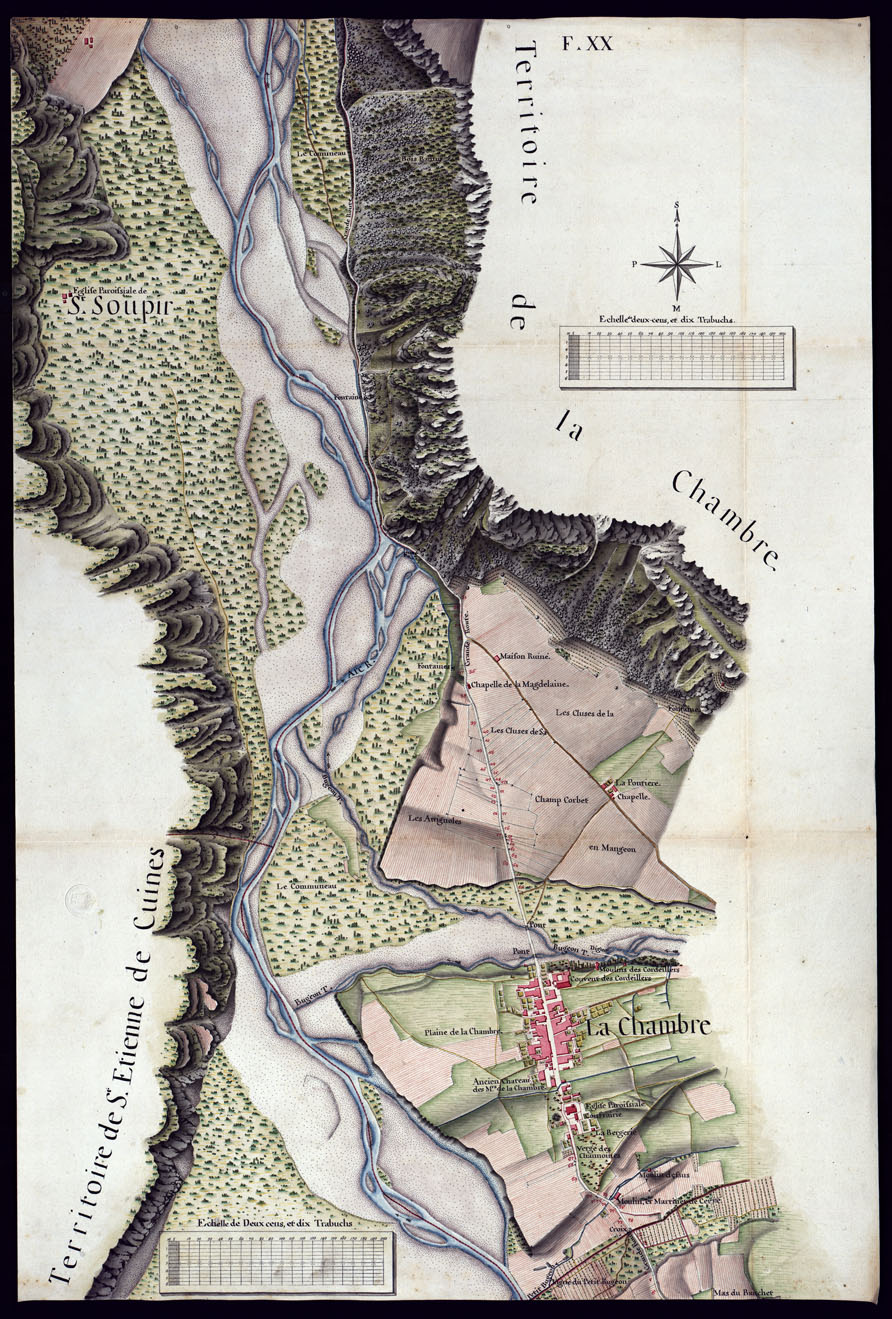 "La Carta è in 23 fogli e un quadro d'unione alla scala di 1:56.700. Scala grafica di 200 trabucchi = m. 0,129. Rappresenta la grande strada che seguendo il corso dell'Arc, mette in comunicazione Chambery con S. Giovanni di Moriana, ed una striscia adiacente di territorio variabile da circa mezzo chilometro ad oltre 1 km. tanto da una parte quanto dall'altra. La carta è frutto di regolari operazioni metriche sul terreno, condotte certo con notevole abilità. Il disegno, acquerellato a più tinte, riproduce accuratamente i caseggiati nella loro pianta geometrica, la rete stradale, i corsi d'acqua, le coltivazioni, la natura e le forme del terreno. Una linea rossa delimita i confini delle parrocchie. Dei piccoli numeri in rosso ai due lati della strada si riferiscono probabilmente agli appezzamenti catastali. In complesso è un pregevole lavoro e un prezioso documento sia per la topografia della Savoia sia per l'evoluzione storica della topografia."