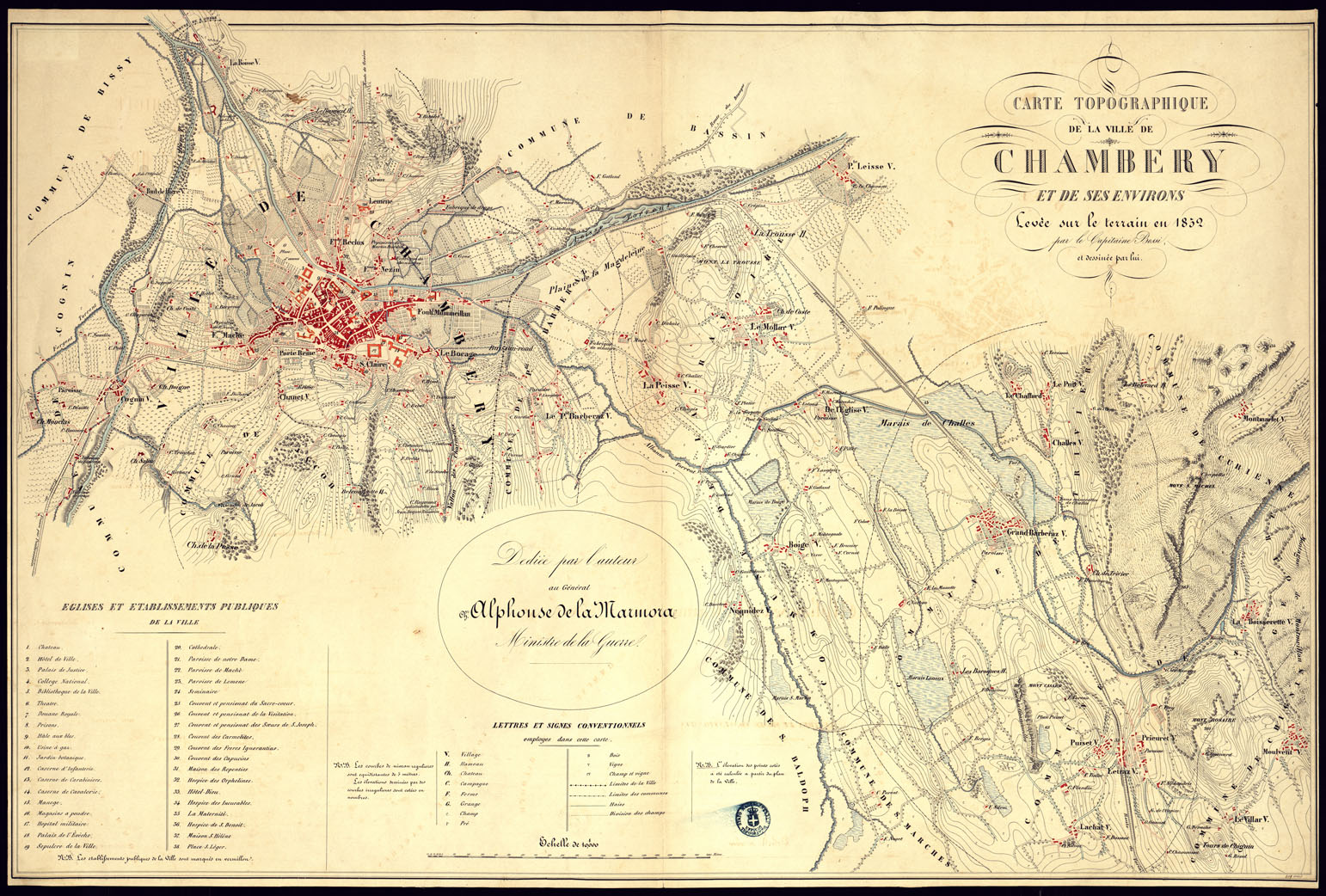 "Un foglio disegnato a penna a tre tinte (azzurro per le acque, rosso per i caseggiati e nero per il resto) con grandissima precisione e nitidezza anche per quanto riguarda la toponomastica. Comprende le adiacenze di Chambéry, a levante del torrente Hiere sino agli abitati di Montmarlet, La Boisserette e Moulvent. Orografia rappresentata con curve equidistanti di 5 m. e coll'aggiunta di quote numeriche riferite al piano della città, come è detto nella leggenda: "L'élevation des pointes cotés a été calculée à partir du plan de la Ville". Gli edifici principali di questa, in numero di 38, sono indicati in apposita tabella e riferiti con numero alla pianta. In complesso un eccellente saggio di levata topografica. In un riquadro a parte la dicitura "Dediée par l'auteur au Général Ch.r Alphonse de la Marmora Ministre de la Guerre.""