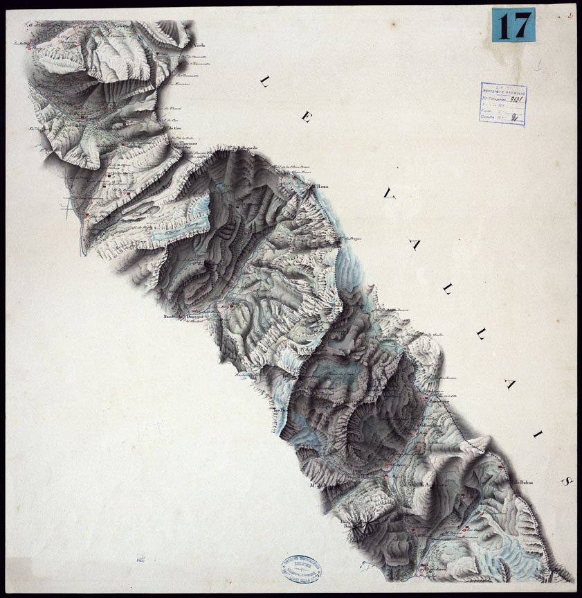 "Otto fogli di diverse dimensioni, più due quadri d'unione, rappresentanti una zona lungo la linea di frontiera, per una larghezza variabile tra i 4 e i 10 km. Disegno a penna accuratissimo a più colori, acquerellato per la rappresentazione orografica con molta efficacia artistica. Confrontati con i fogli corrispondenti della Carta degli Stati Sardi al 50.000, si mostrano più ricchi d'indicazioni topografiche e toponomastiche. Segni convenzionali speciali indicanti i Corpi di guardia e i distaccamenti della 1a e 2a linea per le truppe del Cordone Sanitario. Non portano indicazione di autore ma una registrazione d'Archivio dice che per tradizione di ufficio sono attribuiti al Brambilla. Nella stessa subcartella del documento N° 17 vi è una busta contenente "Tre modelli di topografia in acquerello del celebre Topografo Brambilla Cav. Vittorio 2 alla Scala di 1:20000ed 1 a quella del 40000.""