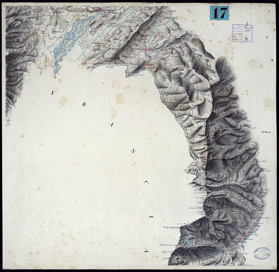 "Otto fogli di diverse dimensioni, più due quadri d'unione, rappresentanti una zona lungo la linea di frontiera, per una larghezza variabile tra i 4 e i 10 km. Disegno a penna accuratissimo a più colori, acquerellato per la rappresentazione orografica con molta efficacia artistica. Confrontati con i fogli corrispondenti della Carta degli Stati Sardi al 50.000, si mostrano più ricchi d'indicazioni topografiche e toponomastiche. Segni convenzionali speciali indicanti i Corpi di guardia e i distaccamenti della 1a e 2a linea per le truppe del Cordone Sanitario. Non portano indicazione di autore ma una registrazione d'Archivio dice che per tradizione di ufficio sono attribuiti al Brambilla. Nella stessa subcartella del documento N° 17 vi è una busta contenente "Tre modelli di topografia in acquerello del celebre Topografo Brambilla Cav. Vittorio 2 alla Scala di 1:20000ed 1 a quella del 40000.""