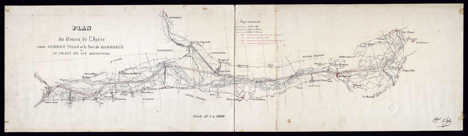 "Un foglio accuratamente disegnato, firmato "Cap. Basso", a penna a più colori allo scopo evidentemente di rappresentare i lavori di canalizzazione dell'Isère. I segni convenzionali distinguono i confini di Stato, di Provincia e di Comune, la nuova strada provinciale d'Alberteville a Chambéry, il ponte di legno di fronte a Gresy costruito nel 1843, con la diramazione della strada provinciale della Moriana e la nuova strada Reale da Torino in Francia. Data non indicata."