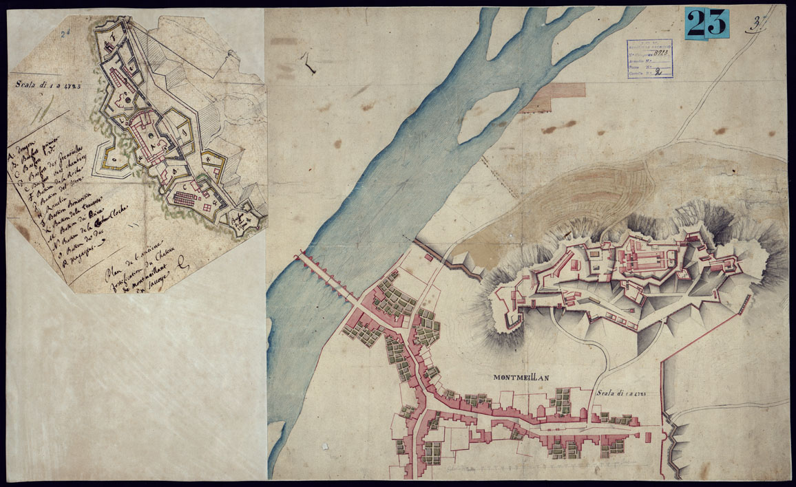 "Pianta dell'abitato e del forte di Montmeillan. Disegno a penna acquerellato senza indicazione di data nè di autore, ma che deve ritenersi degli anni 1817-18. In un angolo del quadro è incollato un "Plan de l'ancienne fortification du Chateau de Montmeillant en Savoye" alla scala medesima di 1:4725 con una leggenda esplicativa delle diverse parti delle fortificazioni e dei fabbricati che esse racchiudevano."