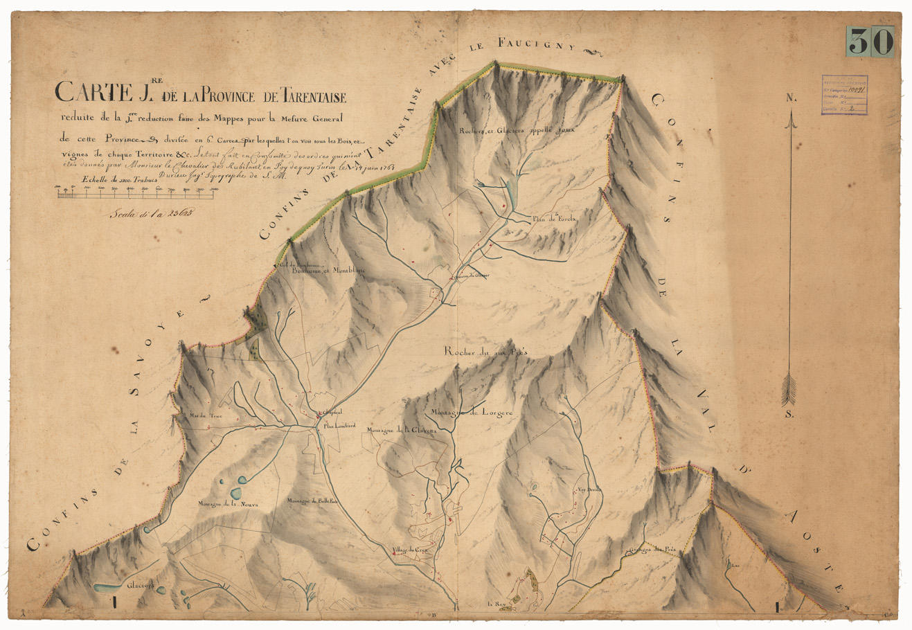 CARTE J. RE DE LA PROVINCE DE TARENTAISE REDUITE DE LA J.RE REDUCTION FAIRE DES MAPPES POUR LA MESURE GENERAL DE CETTE PROVINCE DIVISEE EN 6. CARTES PAR LES QUELLES L'ON VOIT TOUS LES BOIS ET VIGNES DE CHAQUE TERRITOIRE & C. - CARTE 1