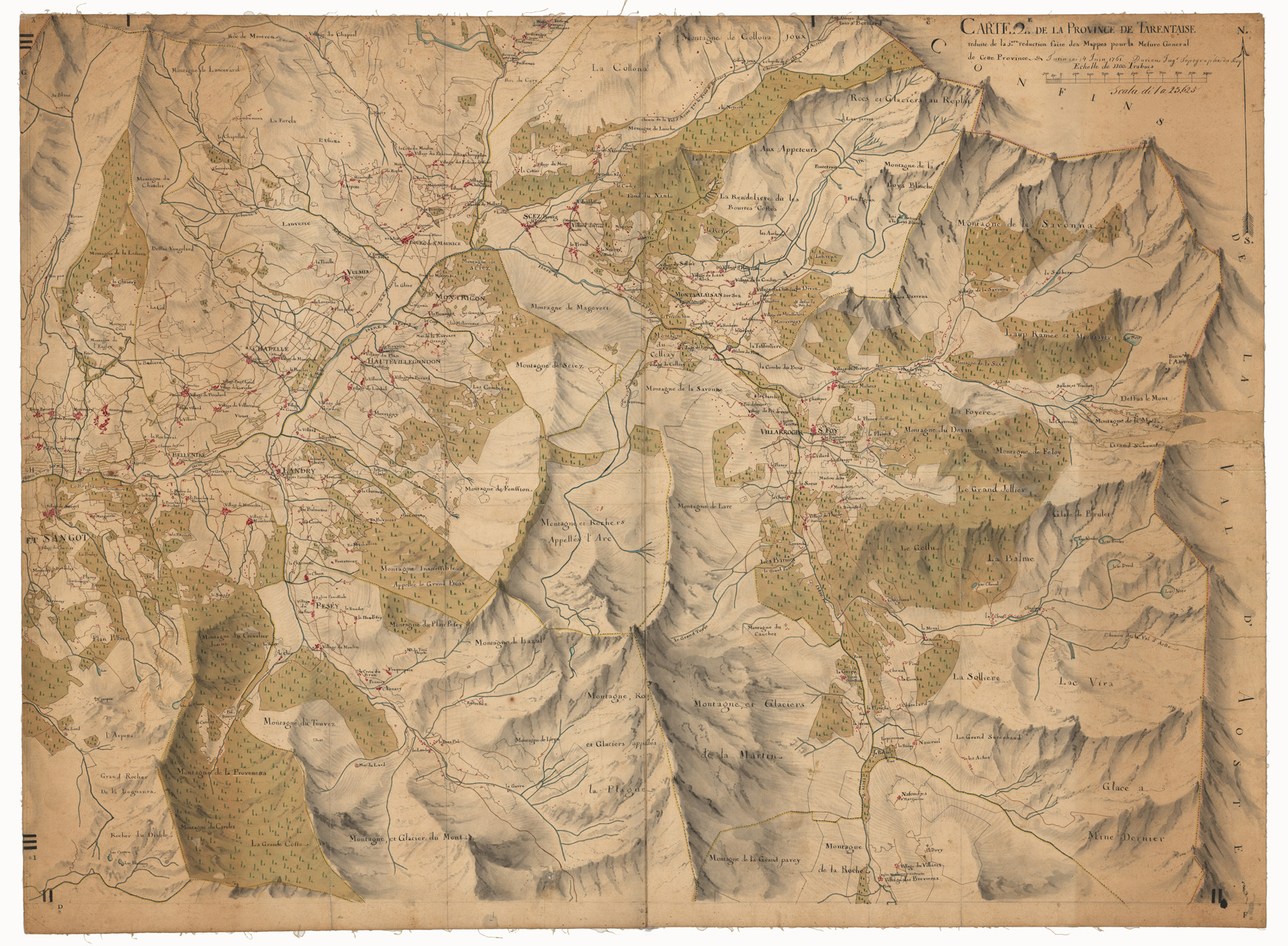 CARTE J. RE DE LA PROVINCE DE TARENTAISE REDUITE DE LA J.RE REDUCTION FAIRE DES MAPPES POUR LA MESURE GENERAL DE CETTE PROVINCE DIVISEE EN 6. CARTES PAR LES QUELLES L'ON VOIT TOUS LES BOIS ET VIGNES DE CHAQUE TERRITOIRE & C. - CARTE 2