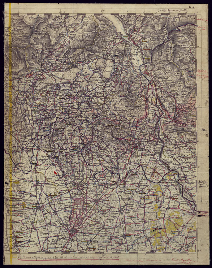 "Ingrandimento fotolitografico, eseguito dall'Istituto Topografico, della carta del Lombardo Veneto realizzata originariamente dall'Istituto Geografico Militare di Vienna alla scala di 1:86.400 e già precedentemente riprodotta (cartella n.51, documento n.1). Questo ingrandimento alla scala 1:75.000 consta di 138 mezzi fogli, in cui sono riportati gli aggiornamenti, eseguiti tra il 1876 e il 1890, per le ferrovie, i corsi d'acqua principali e per le strade rotabili a fondo artificiale."