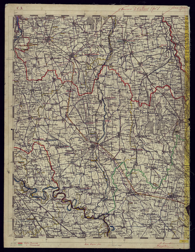 "Ingrandimento fotolitografico, eseguito dall'Istituto Topografico, della carta del Lombardo Veneto realizzata originariamente dall'Istituto Geografico Militare di Vienna alla scala di 1:86.400 e già precedentemente riprodotta (cartella n.51, documento n.1). Questo ingrandimento alla scala 1:75.000 consta di 138 mezzi fogli, in cui sono riportati gli aggiornamenti, eseguiti tra il 1876 e il 1890, per le ferrovie, i corsi d'acqua principali e per le strade rotabili a fondo artificiale."