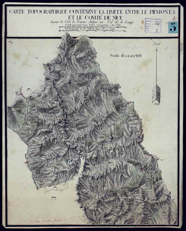 CARTE TOPOGRAPHIQUE CONTENANT LA LIMITE ENTRE LE PIEMONT ET LE COMTE' DE NICE DEPUIS LE COL DE POURIAC JUSQUE AU COL DE LA LONGA.