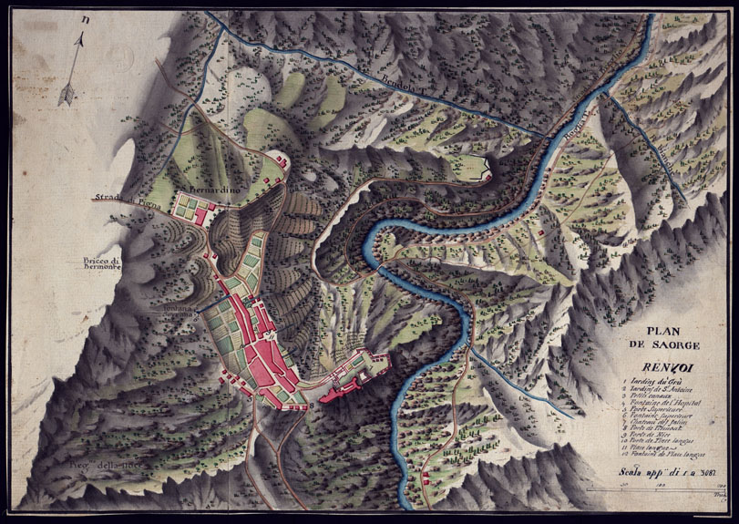 "Piano di Saorge e dintorni oltre il T. Bendola e il T. Roglia. Disegno ad acquerello privo di data e di firma. Orografia a sfumo idrografia in azzurro abitati in rosso vegetazione in verde strade in giallino. A sinistra, in basso, elenco numerico riferito al piano di Saorge. Scala grafica in trabucchi. Orientazione: il nord è spostato leggermente verso est."