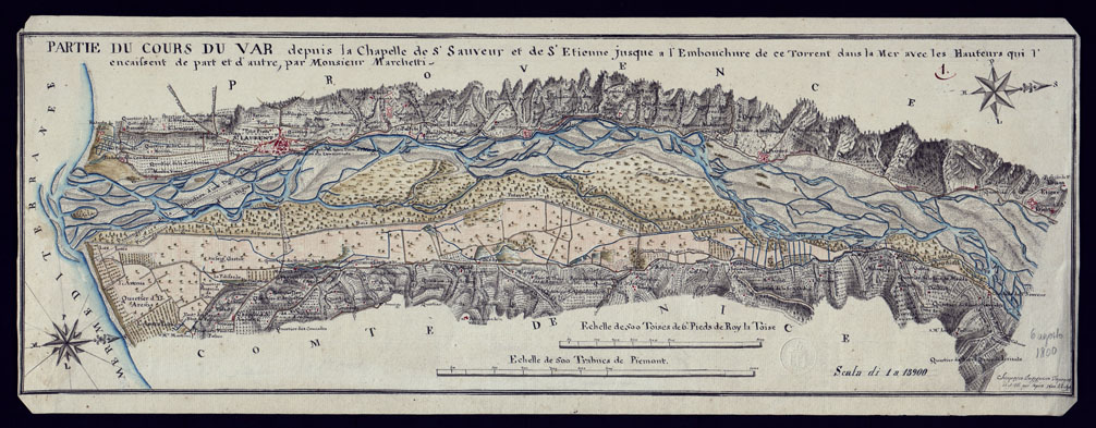 PARTIE DU COURS DU VAR DEPUIS LA CHAPELLE DE S'SAUVEUR ET S' ETIENNE JUSQUE A L'EMBOUCHEURE DE CE TORRENT DANS LA MER AVEC LES HAUTEURS QUI L'ENCAISSENT DE PART ET D'AUTRE, PAR MONSIERUR MARCHETTI.