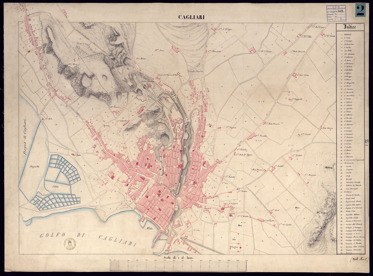 "Pianta della città ad acquerello. Pare che questa pianta sia stata ricavata dai lavori catastali eseguiti in Sardegna tra il 1841 ed il 1847. Nella parte destra della carta l'indice dei luoghi."