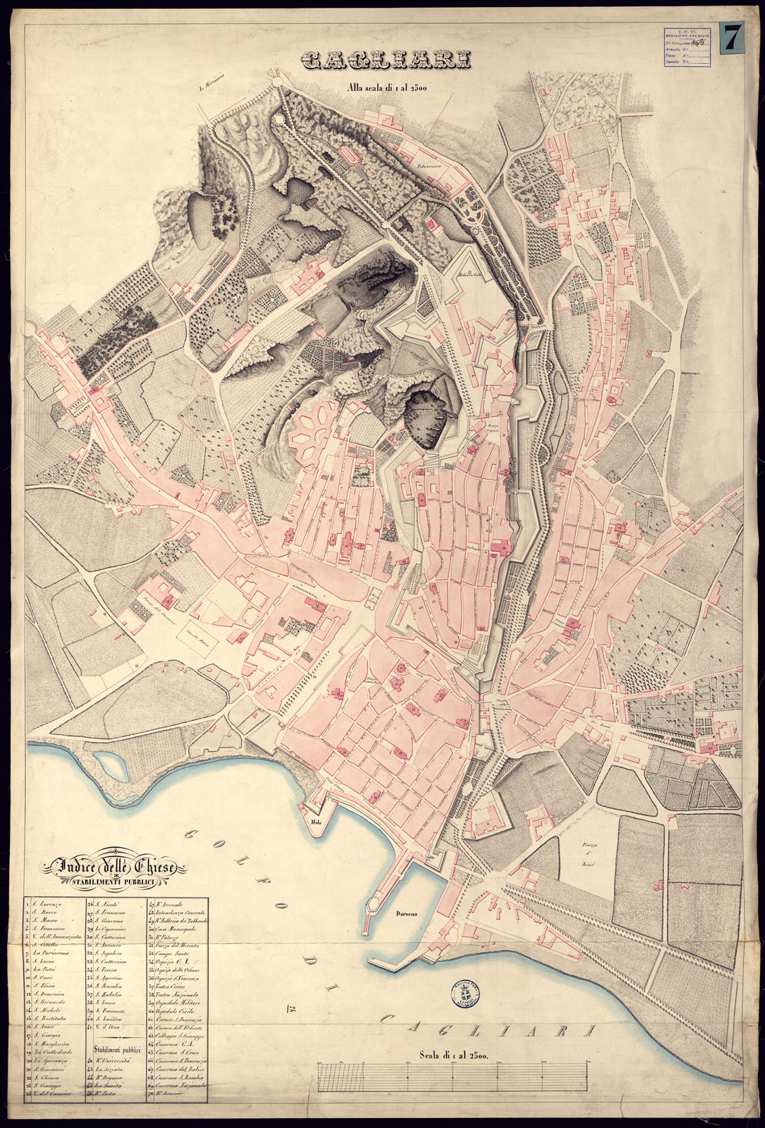 "Disegno accuratissimo della pianta della città di Cagliari. In basso a sinistra reca un "Indice delle Chiese e Stabilimenti pubblici"."