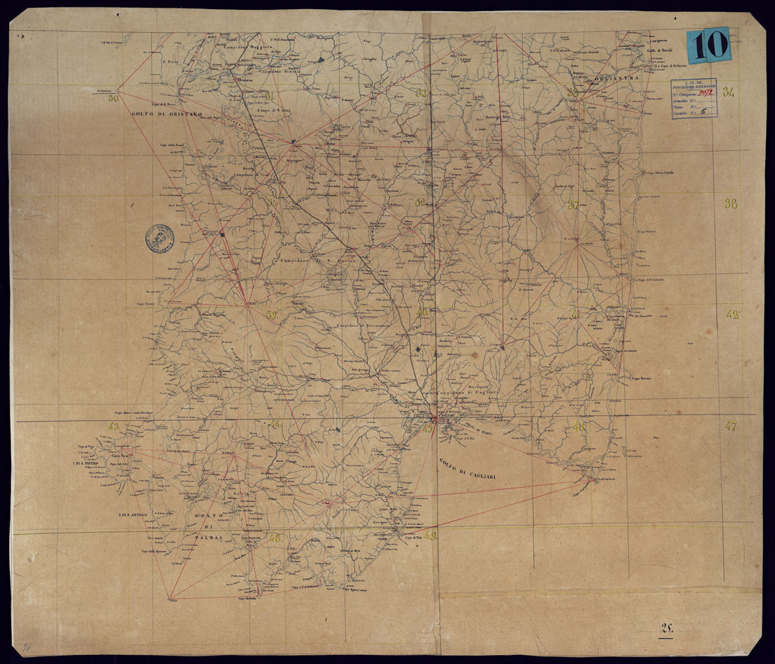 "Il titolo non è presente sulla carta. Carta in due fogli rappresentante la rete geodetica di 1° e 2° ordine per la formazione della carta della Sardegna alla scala di 1:250.000. Vi è indicato il riparto dei fogli alla scala 1:50.000 dell'Atlante allestito nel 1881 sotto la direzione del capitano di S.M.C. De Candia."