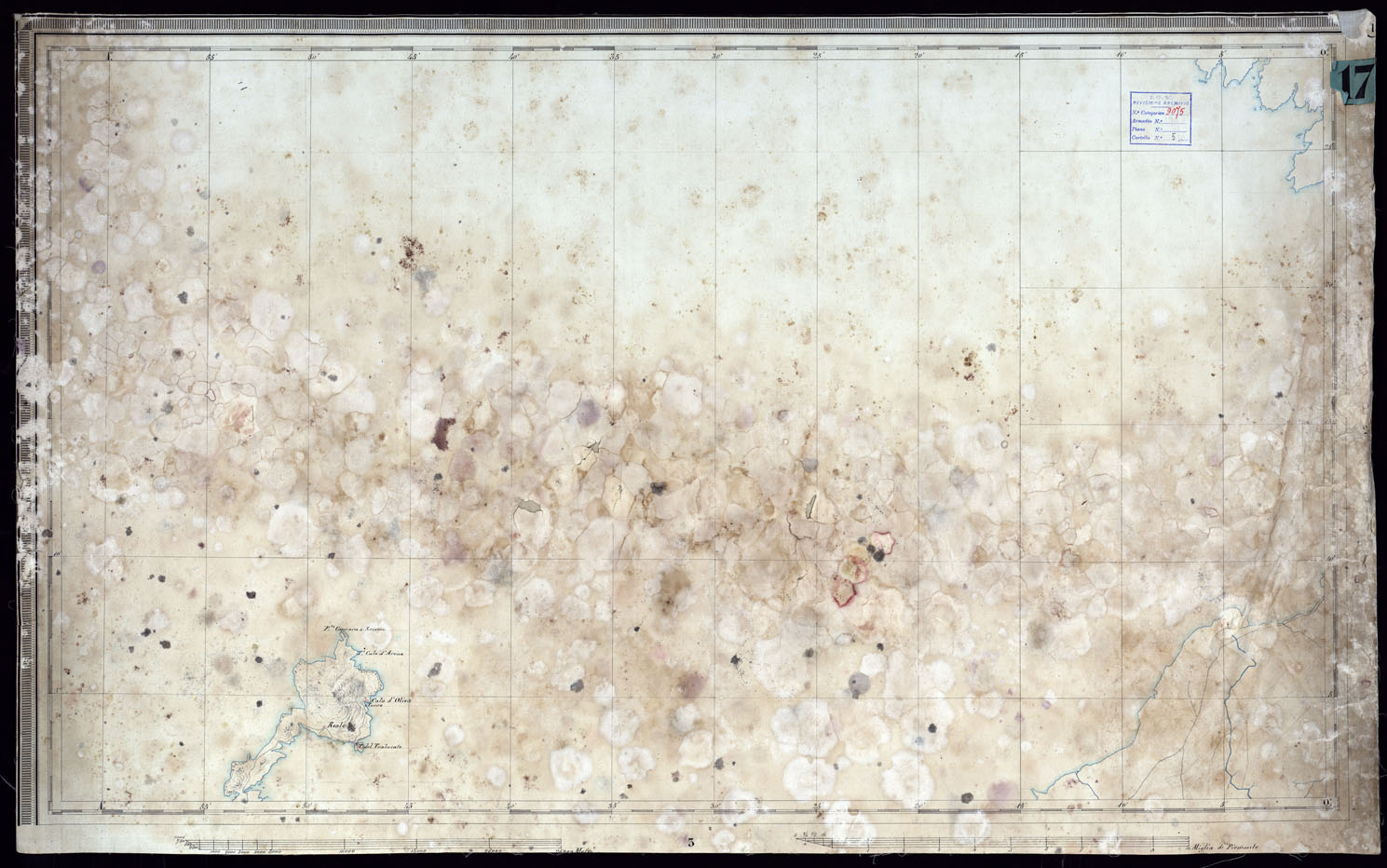 "Carta della Sardegna in 12 fogli più la copertina. Lo stato di deperimento in cui si trova la carta dimostra chiaramente che questa apparteneva a quelle carte catastali della Sardegna che furono salvate dall'incendio del Ministero delle Finanze in Torino e passate poi all'Ufficio Tecnico di Stato Maggiore."