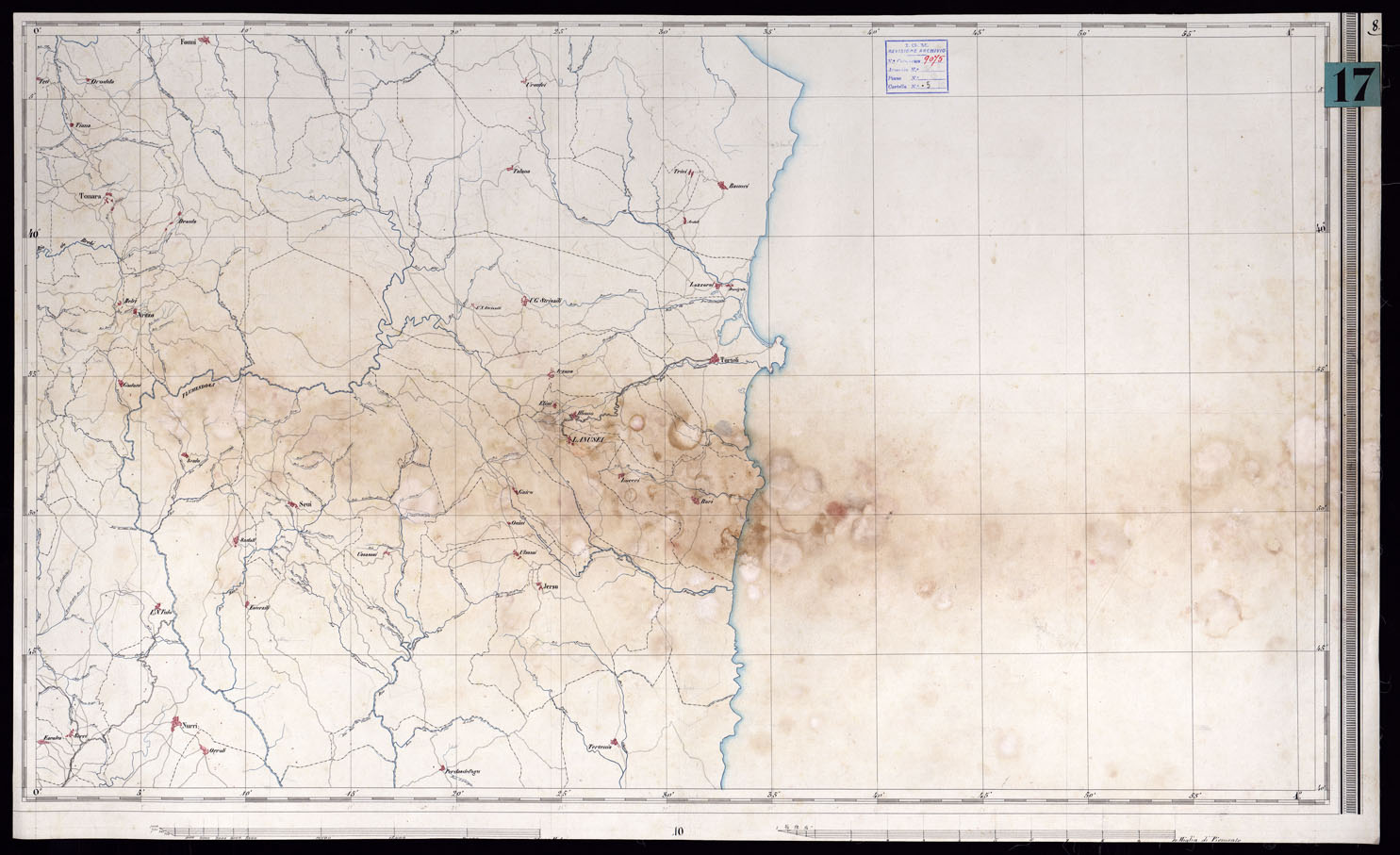 "Carta della Sardegna in 12 fogli più la copertina. Lo stato di deperimento in cui si trova la carta dimostra chiaramente che questa apparteneva a quelle carte catastali della Sardegna che furono salvate dall'incendio del Ministero delle Finanze in Torino e passate poi all'Ufficio Tecnico di Stato Maggiore."