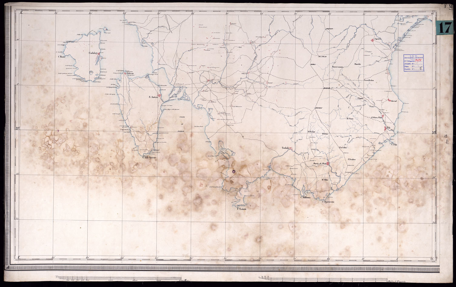 "Carta della Sardegna in 12 fogli più la copertina Lo stato di deperimento in cui si trova la carta dimostra chiaramente che questa apparteneva a quelle carte catastali della Sardegna che furono salvate dall'incendio del Ministero delle Finanze in Torino e passate poi all'Ufficio Tecnico di Stato Maggiore."