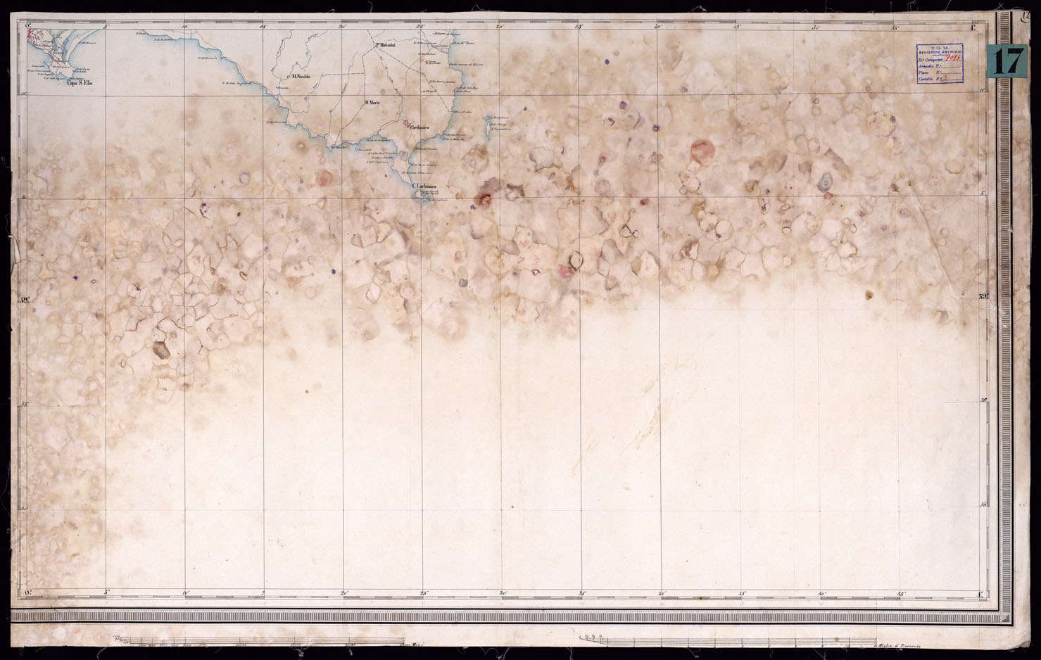 "Carta della Sardegna in 12 fogli più la copertina. Lo stato di deperimento in cui si trova la carta dimostra chiaramente che questa apparteneva a quelle carte catastali della Sardegna che furono salvate dall'incendio del Ministero delle Finanze in Torino e passate poi all'Ufficio Tecnico di Stato Maggiore."