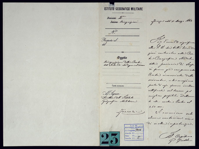 I rilevamenti topografici per la realizzazione della “Carta d´Italia&lrquo” iniziarono nel 1878: si trattava di un´opera così importante e lodevole che meritò la consapevole attenzione, non solo degli addetti ai lavori e delle categorie professionali coinvolte, ma anche delle più alte autorità del Regno.