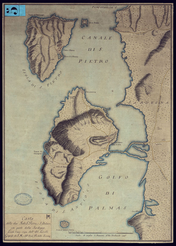 CARTA DELLE DUE ISOLE, S. PIETRO, S. ANTIOCO, CON PARTE DELLE SARDEGNA. LEVATA L'ANNO 1792. DALL'AB.LIRELLI GEOGRAFO DI S. M. E DELL'ACAD. R. DELLE SCIENZE.