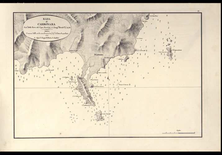 PORTOLANO DELLA SARDEGNA - CARTA IDROGRAFICA DELLA SARDEGNA LEVATA DAL CAVALIERE GIUSEPPE ALBINI CAPITANO DI VASCELLO NELLA MARINA DI S.M. SARDA - RADA DI CARBONARA TAVOLA IV.