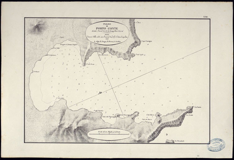 "Torino, Stabilimento Litografico ed Autografico Doyen e C. Si compone di 30 tavole riprodotte in litografia compreso il titolo e la prefazione. Il lavoro fu diretto dal Contro Ammiraglio Albini della Marina di S. M. Sarda. Il disegno venne eseguito dall'Ing. Cordero. L'orografia è rappresentata col tratteggio a luce obliqua. Gli scandagli sono calcolati in braccia di 5 piedi francesi. Le qualità del fondo marino sono indicate a mezzo di lettere. Le longitudini sono calcolate dal meridiano di Parigi. Scale grafiche in miglia e in tese. Il documento è presente anche rilegato (documento n. 6)."