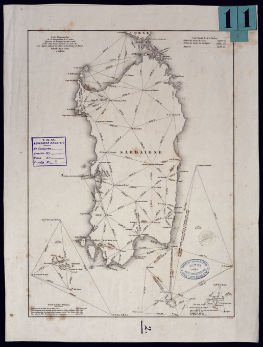 CARTE DEMONSTRATIVE DE LA TRIANGULATION DE 1.ER ORDRE, EXECUTEE EN SARDAIGNE DE 1835 A' 1838 ET DES DEUX BASES MESUREES EN CETTE ILE. (LES CHIFFRES INDIQUENT DES METRES ET DES FRACTIONSE). ECHELLE DE LA CARTE. 1/1,000000.
