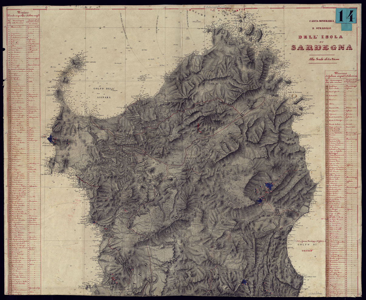 "La carta di base è quela del Gen la Marmora edita nel 1845. Questa carta è stata utilizzata per tutta la seconda metà dell'ottocento come unico documento cartografico valido per la rappresentazione dell'Isola. In questo caso la base cartografica è stata integrata con l'elenco delle miniere e dei giacimenti presenti sull'Isola."