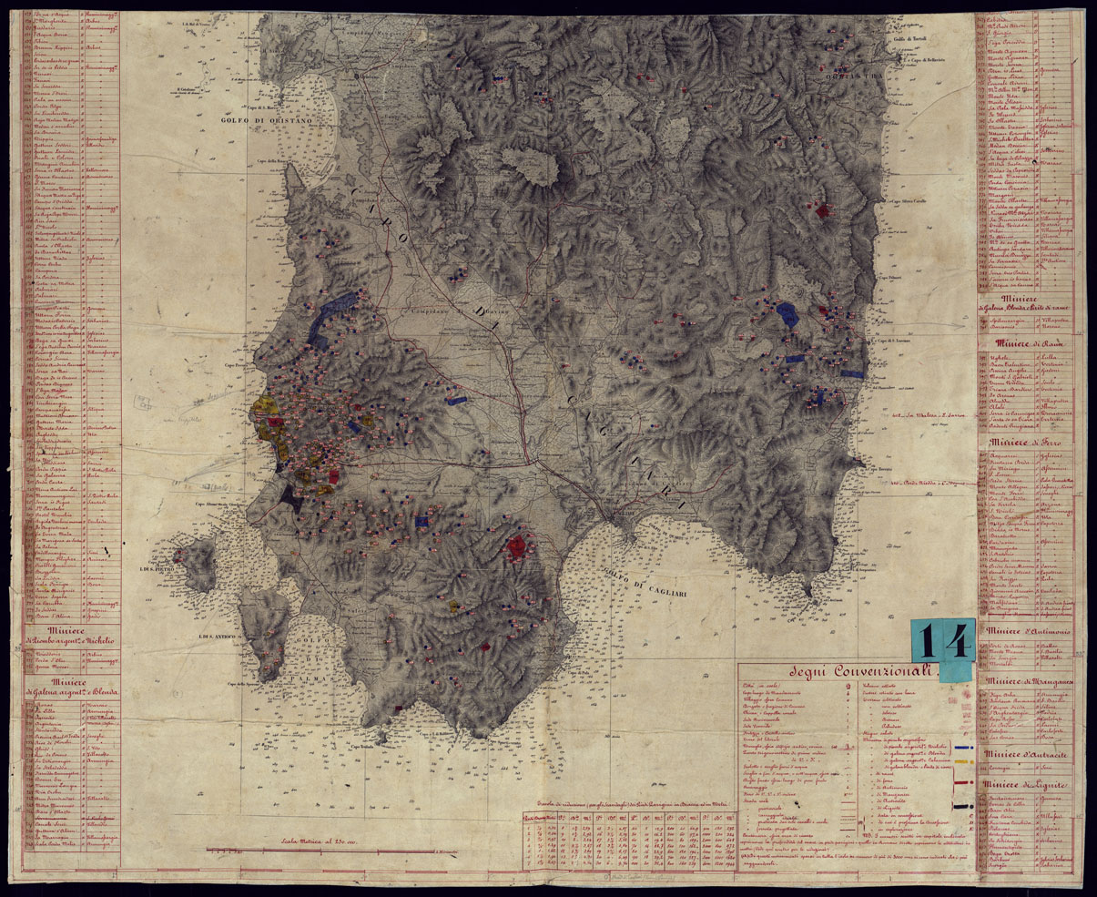 "La carta di base è quela del Gen la Marmora edita nel 1845. Questa carta è stata utilizzata per tutta la seconda metà dell'ottocento come unico documento cartografico valido per la rappresentazione dell'Isola. In questo caso la base cartografica è stata integrata con l'elenco delle miniere e dei giacimenti presenti sull'Isola."