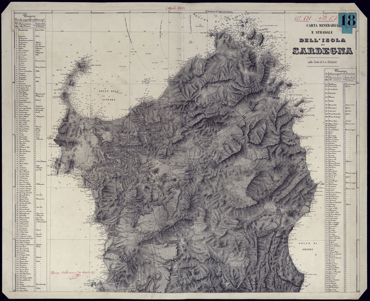 "La carta di base è quela del Gen la Marmora edita nel 1845. Questa carta è stata utilizzata per tutta la seconda metà dell'ottocento come unico documento cartografico valido per la rappresentazione dell'Isola. In questo caso la base cartografica è stata integrata con l'elenco delle miniere e dei giacimenti presenti sull'Isola. Questa copia è probabilmente la riproduzione dell'omonima carta al doc. 14. In alto a penna rossa vi è la scritta "Aprile 1870"."